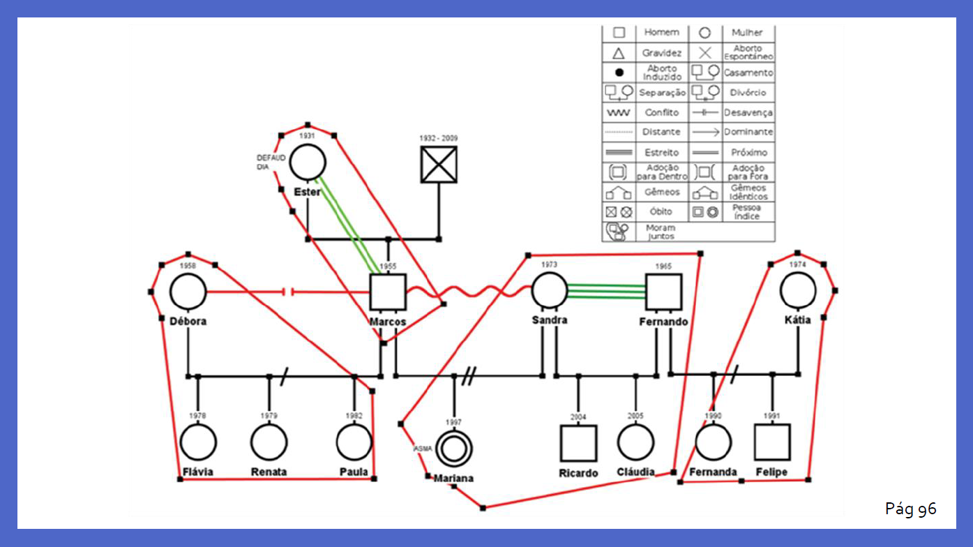 - Laços coloridos ou linhas extras sinalizam relações afetivas negativas ou positivas, conflitos, adoções, etc.;